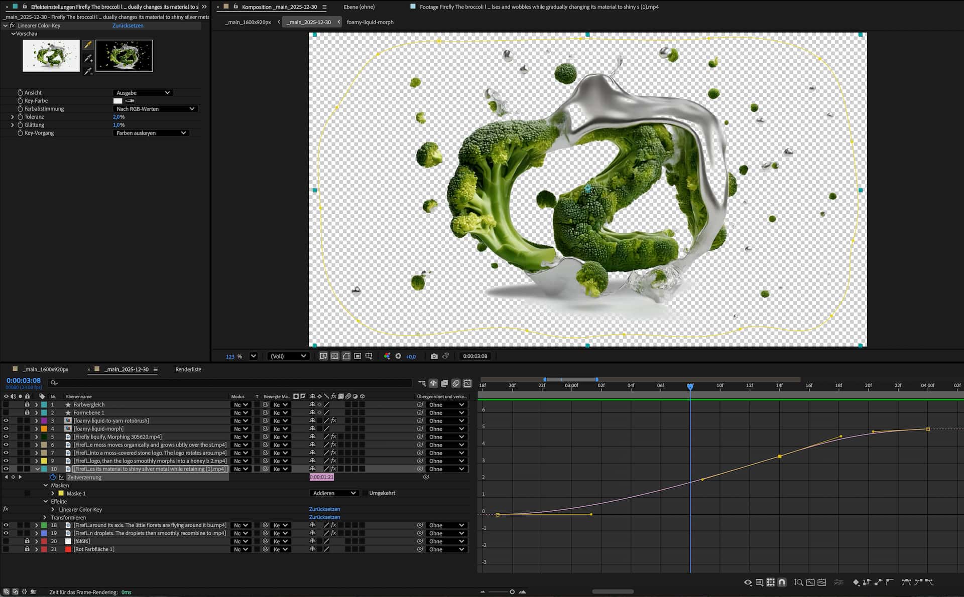ZunĂ€chst werden Farbkorrekturen an den Videos durchgefĂŒhrt. Da in unserem Fall die Hintergrundfarbe teilweise unerwĂŒnscht wechselt und einzelne Elemente aus dem Frame ragen, werden die Teilvideos mithilfe von Masken, âKeyingâ oder dem âRoto Brushâ-Tool freigestellt.