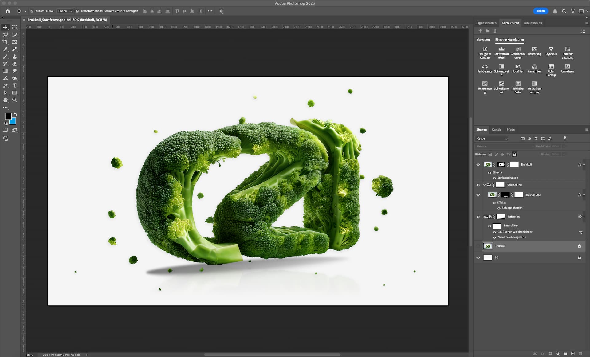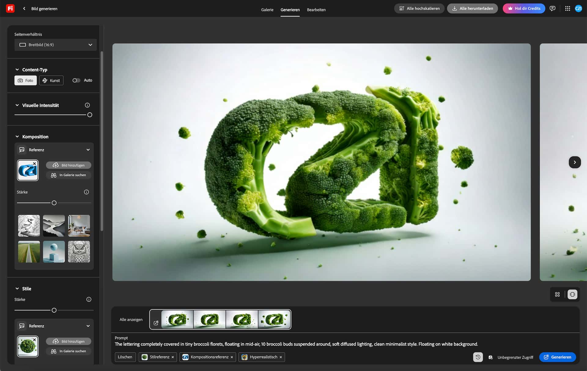 Dabei kann sowohl eine Stil- als auch eine Kompositionsreferenz angeben werden. FĂŒr die Kompositionsreferenz verwenden wir unser Logo im 3D-Look. Dieses erstellten wir zuvor in âIllustratorâ, da das Programm Vektorgrafiken dreidimensional darstellen kann. Als Stilreferenz eignet sich ein Bild, das das gewĂŒnschte Material des Logos zeigt. In diesem Fall soll das Logo aus Brokkoliröschen bestehen. Dieses Bild kann entweder aus vorhandenem Bildmaterial stammen oder ebenfalls mit AI generiert werden.